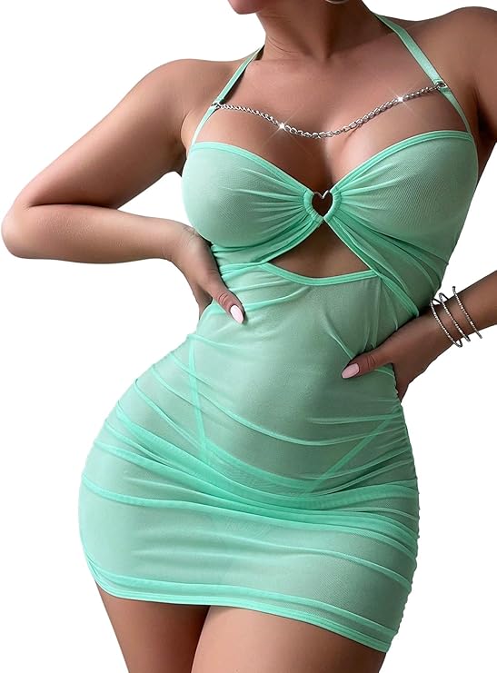 Sexy Chain Sheer Mesh Ruched Bodycon Mini Lingerie Dress with Thong 2 Piece Set Outfits Size/ M